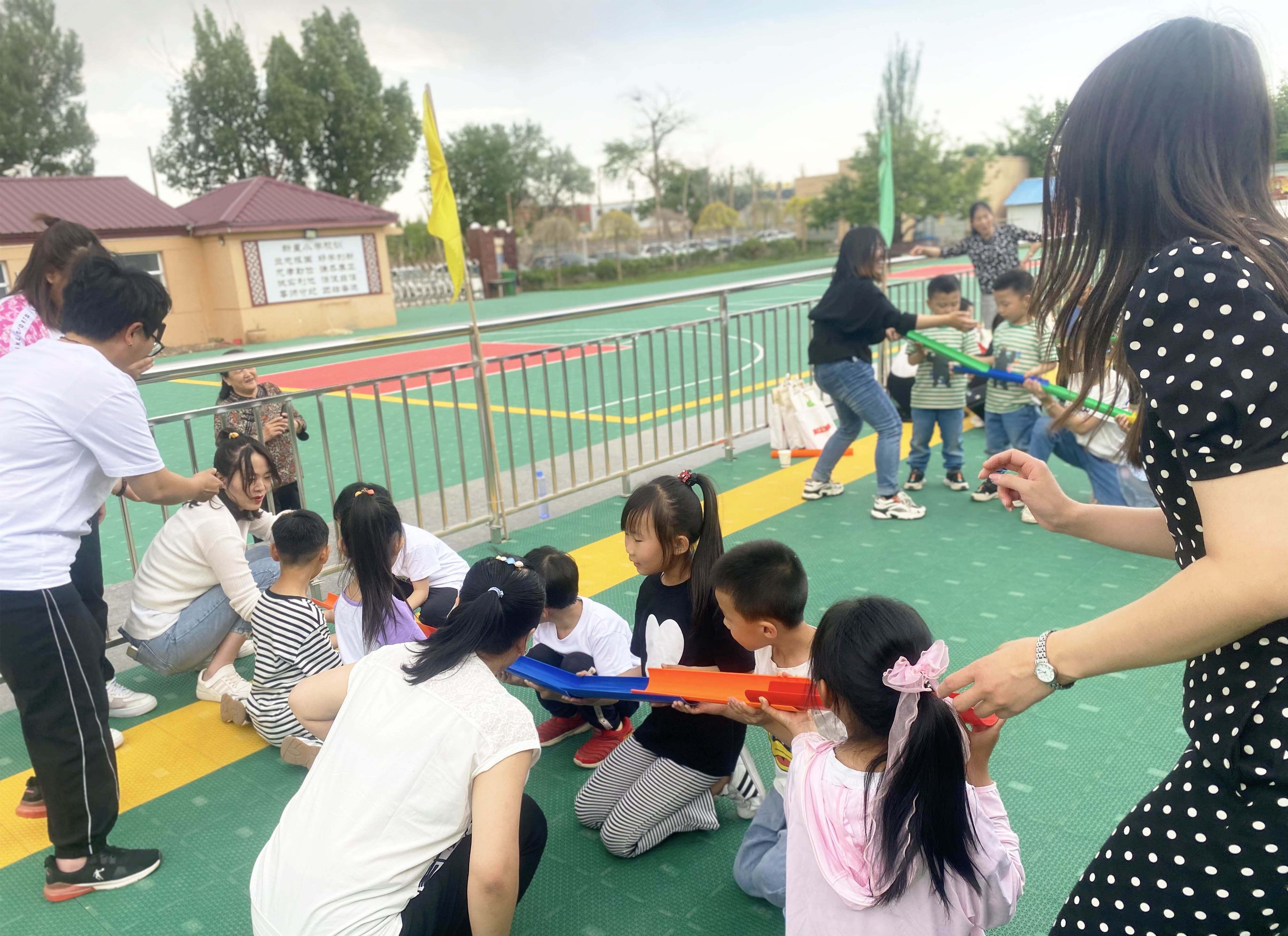 該活動分為小朋友組和家長組。游戲開始時,每個隊員牽拉同心鼓上面綁的繩子,保證鼓面水平,同時裁判將一個排球從鼓面中心上方豎直拋下,隊員齊心協力將球顛起,顛的球越多,為獲勝。 大朋友、小朋友們玩的不亦樂乎。通過三組趣味游戲,讓家長和小朋友們共同協作,完成不同的游戲任務,不僅鍛煉孩子們的團隊配合能力,隨機應變能力,還讓孩子們感受到節日的快樂。