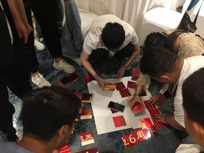 各組的小伙伴們獻計獻策,不斷的互相尋求幫助,雖然是比賽,但是大家似乎已經(jīng)忘記各組的得失,互相指導,一組一組的完成了每一部分的拼接。為了節(jié)約時間,八個小組中提前拼接好的部分先進行組裝,沒有總指揮、沒有領導者、唯一的信念就是快速完成背景板的拼接。最終在30分鐘之內(nèi)完成了拼圖。比我們活動策劃的預計時間提前了一個小時。