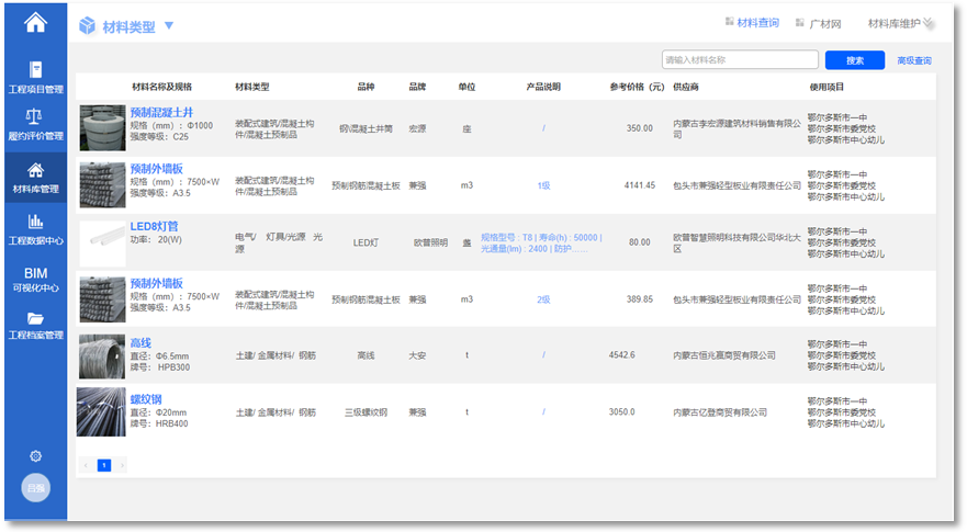 材料庫(kù)主要對(duì)項(xiàng)目過(guò)程中已使用材料的類型、名稱、參數(shù)、價(jià)格、型號(hào)以及所用項(xiàng)目進(jìn)行管理,方便在新建項(xiàng)目時(shí)快速定位同類型、高品質(zhì)、價(jià)格合理的材料。