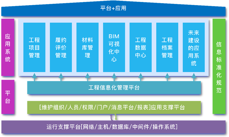 該平臺(tái)由工程項(xiàng)目管理、履約評(píng)價(jià)管理、材料庫(kù)管理、工程數(shù)據(jù)中心、BIM可視化中心、工程檔案管理六個(gè)子系統(tǒng)組成。主要包含了立項(xiàng)管理、前期手續(xù)管理、招投標(biāo)管理、合同管理、設(shè)計(jì)管理、施工現(xiàn)場(chǎng)管理、投資控制、工程驗(yàn)收、質(zhì)保期管理、項(xiàng)目后評(píng)價(jià)、參建單位履約評(píng)價(jià)、工程檔案管理、工程數(shù)據(jù)中心、BIM可視化中心、等功能,對(duì)近40個(gè)業(yè)務(wù)單位進(jìn)行精細(xì)化管理。