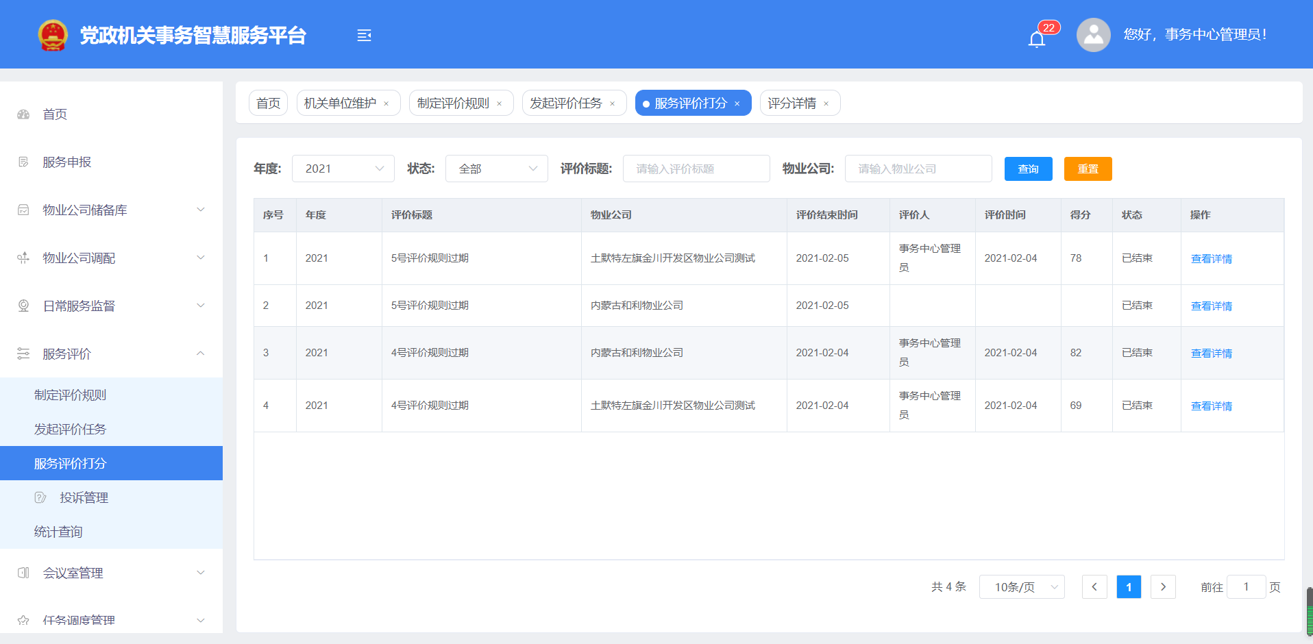 內蒙古和利信息技術有限公司(和利信息)按照國家機關事務管理局“一體兩翼”堅持集中統一管理、堅持以標準化、信息化為支撐為發展思路,在深入研究我區機關事務物業服務現狀的基礎上,同時堅持把物業服務實現科學化管理、標準化保障、精細化服務作為系統研發指導思想。為我區黨政機關事務管理局(中心)研發了“黨政機關物業服務系統”,該系統實現了本級黨政機關、事業單位辦公樓宇物業服務公司實現標準化和信息化管理,所有單位統一物業管理服務標準化、規范化、精細化、智慧化服務,利用信息化手段推進黨風廉政建設和節約型機關建設。該系統可對物業公司、物業服務、服務質量、物業傭金費等進行集中管控,同步實現了物業服務申報、物業公司分配、任務調度管理、會議室管理、日常服務監督管理、服務評價管理、物品管理、傭金管理、日常維護、物業公司儲備庫和物業公司調配等基礎功能(含小程序端)。系統分為4個使用端:分別為機關事務管理局(中心)監管端、黨政機關物業服務端、物業公司管理端和物業員工日常工作記錄端,下面按場景進行系統介紹。