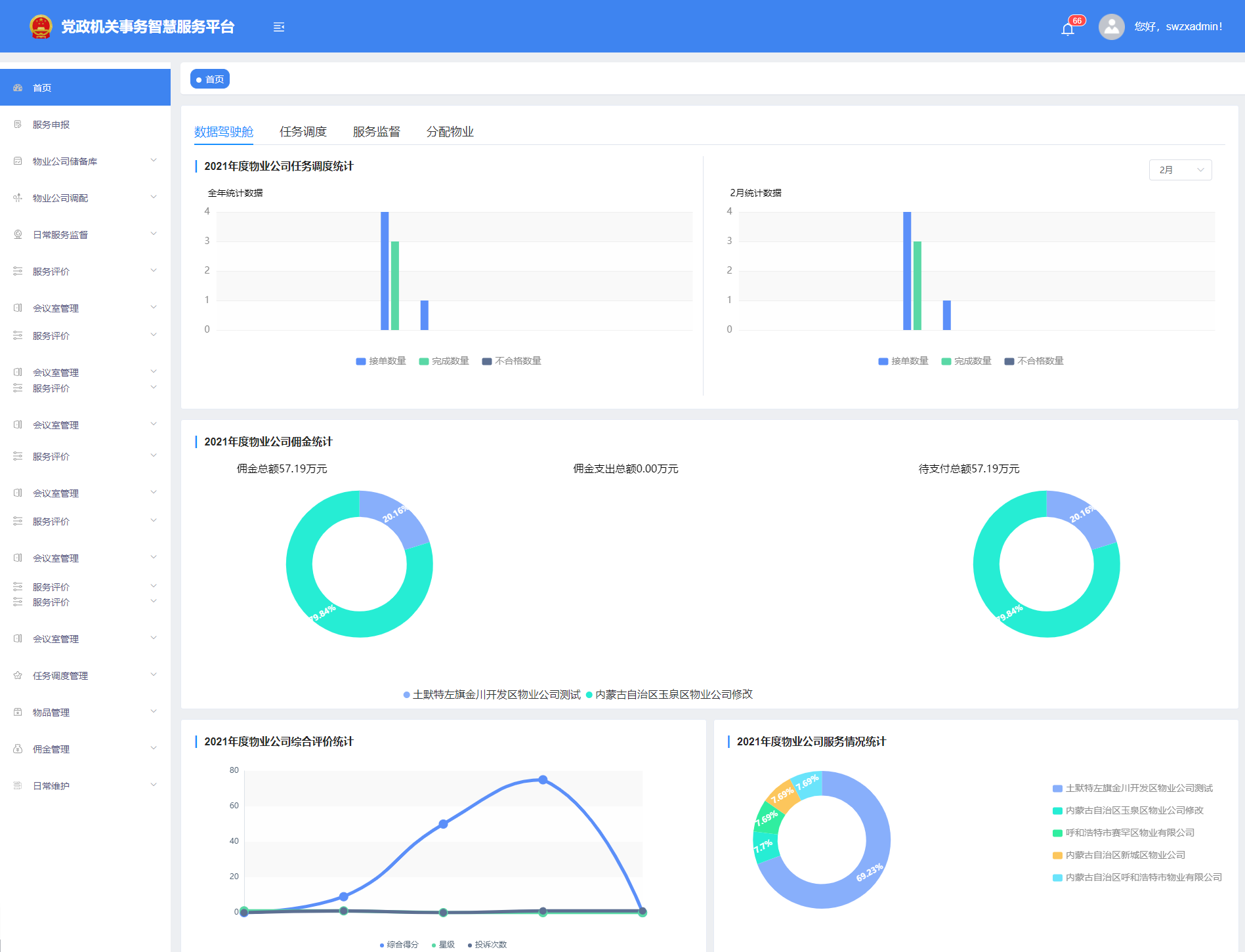 服務申報的審批,物業公司的分配,維修服務審批和會議申請的分配等審批工作。還可以維護物品、維護傭金、維護物業公司和黨政機關信息。查看物業公司服務人員打卡情況,查看檢修、消火栓、日常維修和能源的記錄,還可以對物業公司進行評價。